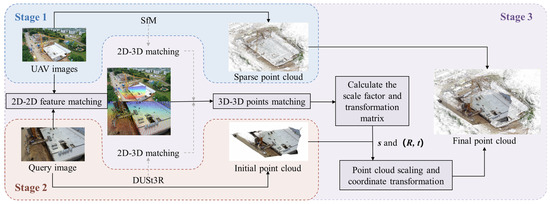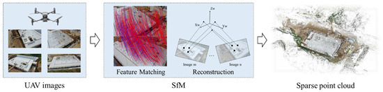 The obtained 3D point clouds can generally correspond to the required coordinate system by marking control points or using the RTK-GPS positioning equipped with the UAV as the absolute coordinates of the camera, so as to ensure the authenticity of their dimensions and coordinates. The above process can be carried out by commercial software such as Agisoft Metashape and Pix4D, or by open-source tools like openmvg [55], colmap [56], and opensfm. The obtained sparse point cloud , with real dimensions and coordinate information, will serve as the benchmark point cloud and benchmark space for the subsequent alignment of 3D information.