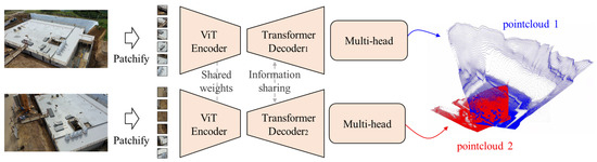 DUSt3R is an image-based unconstrained dense 3D reconstruction method and is the first overall end-to-end 3D reconstruction pipeline for uncalibrated and unposed images. Its model architecture is shown in Figure 3. Firstly, given two images and , the images are divided into patches and encoded. Through the shared Vision Transformer (ViT) encoder, the feature representations and are obtained: