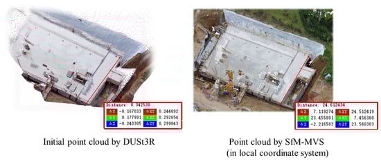 Traditional feature point extraction and matching methods, such as SIFT [57], LIFT [58], ORB [59], and SuperPoint, all require multiple steps, including local feature point extraction, descriptor calculation, nearest neighbor matching, outlier removal, and solving geometric constraints. In the case where there are a large number of repeated 2D features or indistinct features in the images within the site, it is usually difficult to obtain excellent matching results. In contrast, the matching point information based on DUSt3R can fully integrate the global and local 2D feature information. It can share the 2D feature information within the model and directly give dense feature point pairs consistent in three dimensions based on the 3D relationship between the two pictures. Due to the complex situation at the construction site and the possible existence of many regions with repeated features or no features, such as flat ground and repetitive pile-column structures, by adopting the feature point-matching method based on DUSt3R, we can obtain accurate, robust, and three-dimensionally consistent feature point pairs.