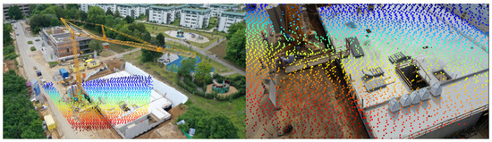 The authors conducted experiments based on the image dataset collected by the Technical University of Munich in Germany [39]. The specific situation is shown in Figure 8. The experimenters selected an under-construction research building with a floor area of 1000 square meters, which measures 25 m × 40 m, as the experimental site. In this experimental scenario, UAVs were used to take images and collect videos of the construction scene with a resolution of 3840 × 2160 pixels. Meanwhile, three surveillance cameras were deployed on the tower crane with a resolution of 3840 × 2160 pixels. Their heights from the ground were 30.2 m, 28.2 m, and 14.3 m, respectively. Their viewing angles would change as the crane operated, and the direction of the viewing angles could also be changed through the control system, as shown in Figure 8a. Based on the pictures and videos provided in the dataset, the authors extracted a total of 339 UAV images as the benchmark images for the 3D point cloud reconstruction of oblique photography. The resulting orthophotos and the sparse point cloud are shown in Figure 8b,c. In addition, 101 images from the surveillance cameras were selected as the sequence images for verifying the 3D point cloud reconstruction algorithm proposed in this paper.