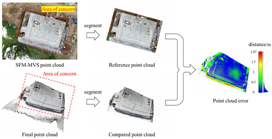 Due to the influence of point clouds of trees and other objects around the construction site, this study only focuses on the reconstruction results within the construction site. Through the preset area of concern, the SfM-MVS point cloud and the point cloud to be compared are cropped based on the same xy plane range. Subsequently, the point cloud distance from the point cloud to be compared to the cropped SfM-MVS point cloud is calculated as the point cloud error, as shown in Figure 9.