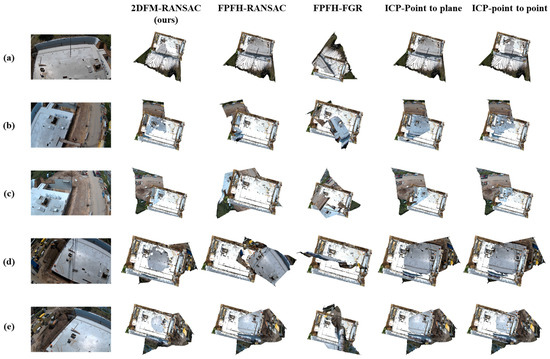 To verify the advantages of the proposed point cloud reconstruction method, the authors compared the proposed method with existing point cloud registration methods, which include (1) global registration methods, such as RANSAC based on FPFH (Fast Point Feature Histograms) [62], and FGR (Fast Global Registration) [63] based on FPFH and (2) fine registration methods, such as ICP (Iterative Closest Point) point-to-point and ICP point-to-plane.