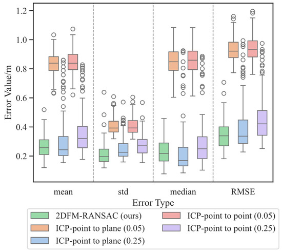 Meanwhile, in order to show the variation range of errors of each method under different working conditions, Figure 11 shows the error distribution of each working condition. The errors of the global registration methods are relatively large. It can be seen that under the two indicators of mean error and RMSE, compared with the several other methods, the overall error distribution of 2DFM-RANSAC is smaller than that of the other methods. In the case of standard error, the overall distribution of 2DFM-RANSAC is lower than that of the other methods, but there are a few outliers, which are a result of whether the error distribution is uniform or not.