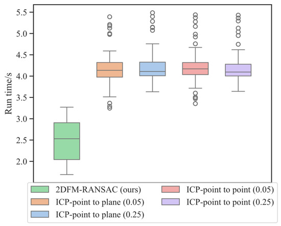 Among them, since ICP requires a rotation and displacement matrix as the initial transformation, in the normal operation process, the registration results of RANSAC or FGR are usually input as the initial transformation of ICP. Considering that the existing global registration methods have relatively large errors in the current scenario, in this study, the registration results of 2DFM-RANSAC were offset to a certain extent and then input as the initial transformation of ICP. In this study, the offset parameters we selected were 1 m, 1 m, 1 m, and an offset of 5 degrees along the z-axis, which are significantly better than the results of FPFH-RANSAC and FPFH-FGR. Moreover, for 2DFM-RANSAC, there is no need for a corresponding initial rotation matrix. In other words, it can be applied under circumstances where the offset is much larger than these parameters. In addition, for the ICP algorithm, downsampling is generally carried out. In this study, following the examples of Open3D [66], 0.25 m and 0.05 m voxel grid filtering were, respectively, selected as the downsampling parameters based on the site size.