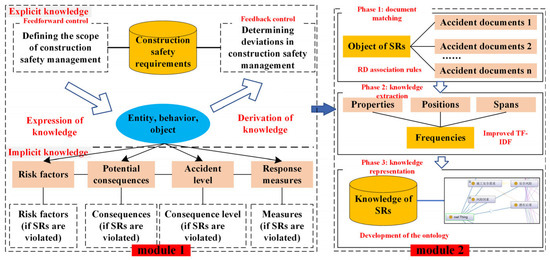 The extensive requirement information generated from construction safety management is highly applicable and can support managers in decision making. This information is part of the SRs and records the details of entities, actions, and objects [1]. Moreover, managers can discover the tacit knowledge associated with SRs through knowledge transfer and thus assess the safety status of the site [2,3]. In this context, transforming the various types of requirements information into knowledge that can be directly applied to site safety management is crucial for enhancing the performance of safety management.