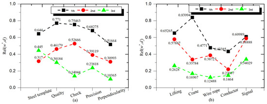Concomitantly, the RD association rule was used to calculate the match between the object elements of SRs and accident case documents, and accident cases with high association degrees were selected as data sources for knowledge extraction. In this study, three accident case documents with the strongest importance (top three associations) were selected as target documents for knowledge extraction in conjunction with the calculation results, and the results are depicted in Figure 3. Figure 3a shows that the largest match for civil buildings is the accident case document corresponding to “quality” (), which also corresponds to accidents mainly due to defective quality of formwork, which is highly compatible with the requirement information recorded in the document Special Construction Program for Steel Formwork Construction.