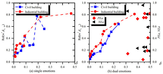 Moreover, this study calculated the association results of single-emotion documents and double-emotion documents separately, and the results are depicted in Figure 4. Among them, the horizontal coordinate is the weight coefficient of the matching rule, which indicates the variation of the association degree with , while the vertical coordinate is the association degree. Meanwhile, “steel template” and “lifting” were selected as the object elements for document matching in civil and industrial buildings, respectively, and the top 10 accident case documents were finally associated as the analysis objects. Figure 4a shows the retrieval status of a single-emotion document, where industrial buildings in the weight coefficient are larger when the association degree is strong (), while civil buildings are relatively weak. Meanwhile, as increases, the corresponding document matching degree shows an increasing trend but fails to show an incremental increase. This result reflects that the RD association rule is not much affected by in single-emotion documents and is mainly affected by semantic similarity.