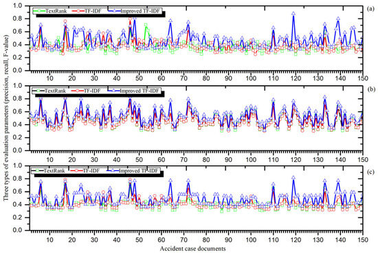 To facilitate the improved TF-IDF algorithm to extract knowledge from documents, the collected documents in this study were divided into a training set and a test set. The test set comprises six accident case documents with high relevance, as matched above, while the training set consists of the remaining 150 accident case documents. For improved comparative analysis, this study selected the cause of the accident in each document as the corpus and used the corresponding document label as the keyword. To comprehensively compare the performance of different algorithms for the extraction of tacit knowledge keywords, this study also applied the TextRank algorithm and the TF-IDF algorithm for testing, corresponding to the evaluation metrics of precision, recall, and F-measure, and the test results are recorded in Figure 5a,b,c, respectively.