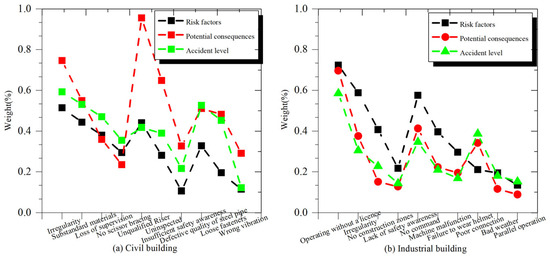 The importance of the third document is relatively low, with a maximum weight of only 0.3281. Also, most of the potential consequences are “casualties”. The factors categorized as larger accidents at the accident level are “irregularity” and “substandard materials”, both from the first document. For industrial buildings, Figure 6b shows that four factors were also extracted from this document, with a maximum weight of 0.7233 corresponding to “operating without a license” and the weight corresponding to “irregularity” is also higher (0.5883). The last two documents extracted three factors, and the weights were lower. Compared to civil buildings, the extracted tacit knowledge in industrial buildings is more dependent on a particular document.