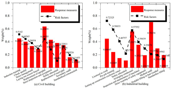 To derive effective response measures, this study employed an improved TF-IDF algorithm to extract tacit knowledge from accident case documents. The extraction results, as shown in Figure 7, identify the response measures with the highest weights for the corresponding factors. Additionally, more than three response measures were selected for each factor through a combination of algorithmic analysis and manual evaluation. For civil buildings, the response measure corresponding to the safety risk factor “irregularity” is “induction training”, with a weight of 0.4502. The response measure corresponding to the safety risk factor “substandard materials” is “induction training”, with a weight of 0.4502. Accordingly, “substandard materials” corresponds to “check quality”. For industrial buildings, “operating without a license” corresponds to “licensed to work”, and “no construction zones” corresponds to “setting up construction exclusion zones”. These responses were taken from accident case documents and are the most critical.