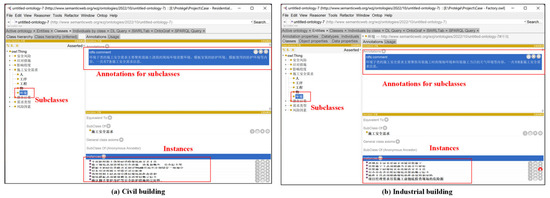 Next, this study imported instances of each class for constructing a complete domain ontology knowledge base for the knowledge transformation of SRs. Thus, instances corresponding to each class were imported into Protégé, and annotations were added to each class. According to the distribution of knowledge, the SRs class belongs to explicit knowledge and includes 10 pieces of information corresponding to five keywords (object elements). Moreover, six strongly correlated documents were obtained from the matching results of the accident case documents for extracting the tacit knowledge of SRs. Further, 10 safety risk factors (i.e., risks that may be triggered when SRs are violated) were extracted for both types of buildings. Accordingly, potential consequences, accident levels, and response measures were extracted corresponding to the identified risk factors. At this stage, instances of this knowledge can be generated and integrated into the platform.