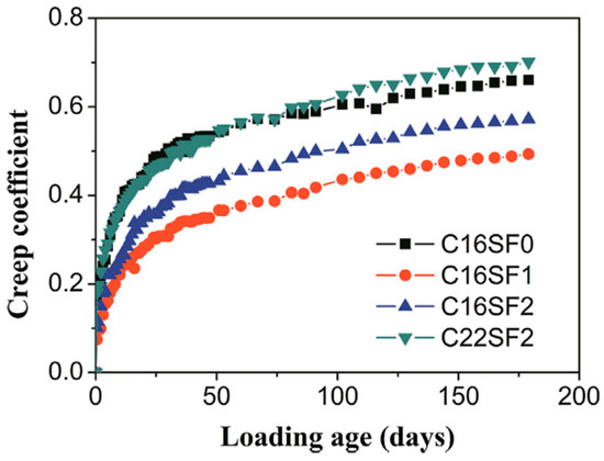 Concerning the compressive strengths of these two specimens with the largest difference in creep coefficient, C16SF1 is 152.5 MPa, while the C22SF2 value is 150.6 MPa. Therefore, it can be concluded that the strains of UHPC under long-term load do not depend only on its strength, but it is necessary to include several influencing factors including the composition of the mix to perform the creep analysis as accurately as possible. In this paper, the authors concluded that the elastic modulus significantly influences the creep strains of UHPC.