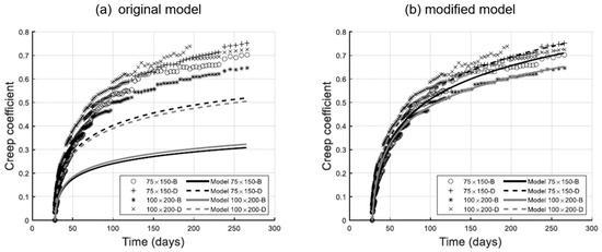 Comparison of experimental results with results obtained according to standard: (a) original FIB MC 2010, and (b) modified FIB MC 2010 (B—basic, D—drying).