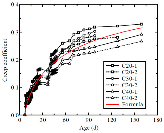 While comparing the results obtained using Equations (15) and (16) in Figure 4, it was concluded that the model provides sufficient accuracy in the creep coefficient estimate. The test results showed that creep develops rapidly between the 5th and 30th day after concrete casting, while the increase in creep coefficient is slight after 90 days.