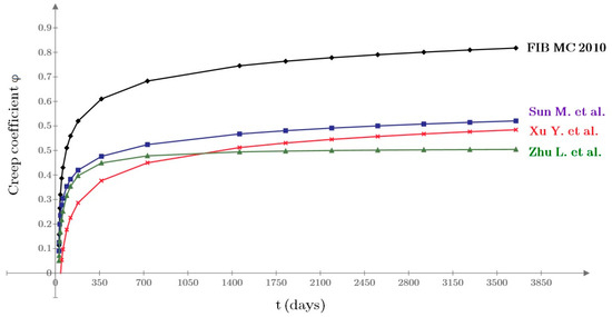 The creep coefficient development at time t for the considered specimen according to three modified creep models and according to the model given in FIB MC 2010 is shown in Figure 5. Concerning FIB MC 2010, the creep diagrams obtained according to [18,22,25] describe the behavior of UHPC under long-term load well and the ordinates are considerably smaller. By considering the values of the creep coefficient after ten years, according to the FIB MC 2010, its value is 0.826, while according to the model given in [25], it is 0.454, which represents an increase of 82%.