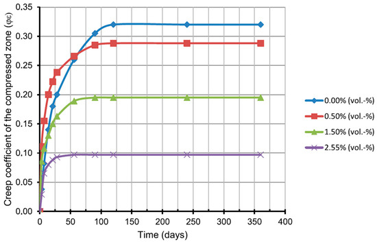 The maximum value of the creep coefficient from the compressed zone, at 360 days, was 0.32 for the beam without steel-fiber additions, while in the case of the beam with 2.55% (vol.-%), steel-fiber addition was 0.097, which means a decrease of 70% (Figure 6). The differences between beams with percentages of 0.50%, 1.50%, and 2.55% (vol.-%) steel-fibers were about 30%. This can be related to the moment of inertia of the cross-section, which increases with the increase in the steel-fiber addition from 0.50% (vol.-%) to 2.55% (vol.-%). This fact directly influenced the instant and long-term deflection because of the increasing stiffness.