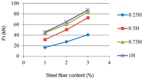 In previous studies, it has been observed that the addition of steel fibers changes the type of cracking on UHPC specimens, from total damage or sudden cracking to a somewhat ductile behavior where the specimens can remain intact without crushing and separating [53]. In addition, it is known that compressive strength is not affected by the addition of large amounts of steel fibers [54]. However, in the work of El-Din H.K. et al. [55], the test results showed that the increase in the volume fraction of the steel fiber from 0% to 3% for UHPC causes a maximal increase in compressive strength by 18.2%, flexural strength by 40%, and tensile strength by 66.1%. A detailed analysis of the influence of the content, type, and combination of different fiber types on the compressive and tensile strength of UHPC is given in [56].