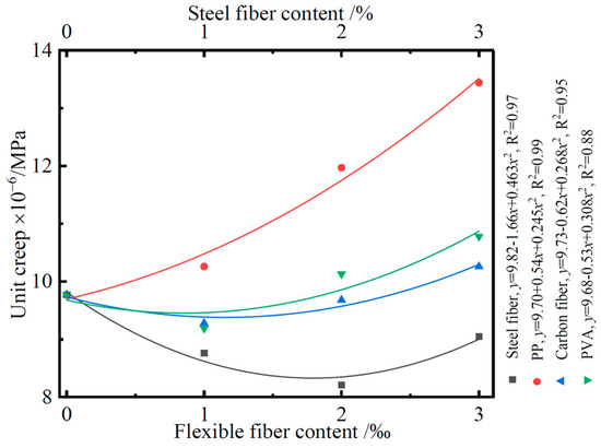In general, it is recommended to use a volume percentage of 0.5% steel fibers for practical application in UHPC structures [26]. Thus, steel fibers affect the reduction in concrete creep, but excessive addition of fibers (from 2% to 3%) can sometimes cause an increase in creep strain. This was confirmed in research [60], where the authors concluded that the interface layer between fiber and concrete matrix can increase the creep of the concrete. The effect of interface layer on the creep increases at an excessive dosage of steel fibers.