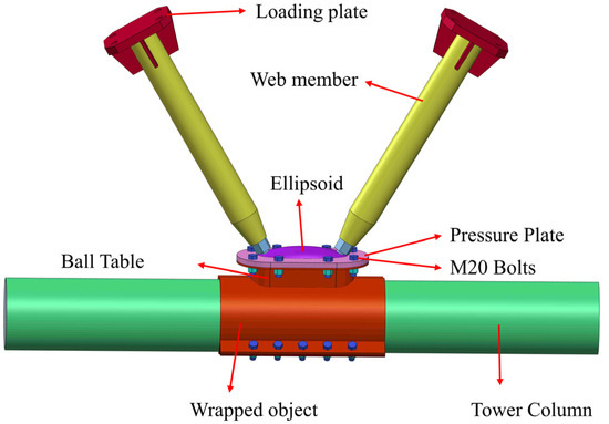 Previous research on lattice towers has focused on intersecting joints (including K, T, X and other shapes), and has been relatively fruitful [10,11,12,13,14,15,16,17,18]. However, several problems must still be addressed to promote the use of lattice towers. Multiple welds are required at the joints, which have high requirements for welding accuracy. Welding at high altitudes is difficult, and the weld is prone to residual stress. Therefore, this research group proposed a prefabricated joint and successively studied the spherical plate joint, the bolt ball universal joint, universally wrapped assembled joints, and the flange spherical joint [19,20,21,22]. Because the first few joints have many parts, they require many bolts to be installed, and the axes of the tension web member and compression web member do not intersect the tower column, resulting in unreasonable force transmission. To reduce construction difficulty, improve construction efficiency, and optimize the force transmission of the joints, ellipsoidal joints are proposed. In this paper, the stress distribution characteristics and damage mechanisms of four ellipsoidal joints were derived from static loading tests.