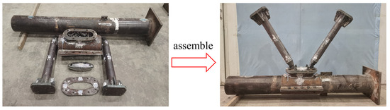In this work, the wall thicknesses of the ball table and the web member served as variation parameters. A total of four scaled test pieces with ellipsoidal joints were designed and manufactured. Figure 1 shows the joint structure diagram, and the dimensional parameters of each component are shown in Table 2, while the material strength tests are shown in Table 3. The machining of all parts of the sample was performed by a machine shop. A simple schematic of the sample is shown in Figure 3, and an assembly diagram of the sample is shown in Figure 4. The tower column was constructed from a 20 Mn seamless steel pipe. After being transported back to the laboratory, it was filled with concrete of strength class C40. The ellipsoidal bolt ball was made of 45# steel, and the remaining parts were made of Q235 ordinary carbon steel.