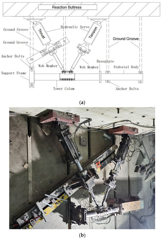 This test uses a horizontal loading position, as shown in Figure 5. To avoid additional bending moments caused by the deflection of the thrusted web member during the loading process, which would affect the accuracy of the test, a lateral displacement prevention device is installed at the thrusted web member. The thrust and tension web members are loaded at a ratio of 1.1:1. The loading is controlled by both the load and displacement, and the maximum load-bearing capacity and maximum displacement of the test piece are analyzed theoretically using the Abaqus software. Loading was carried out in the load control mode until local buckling occurred at intervals of 10% of the theoretical ultimate load. After the load reached 80% of the theoretical load or the sample exhibited significant local buckling deformation, loading was switched to displacement control, with each load step equal to 1 mm, and loading was carried out until failure.