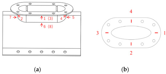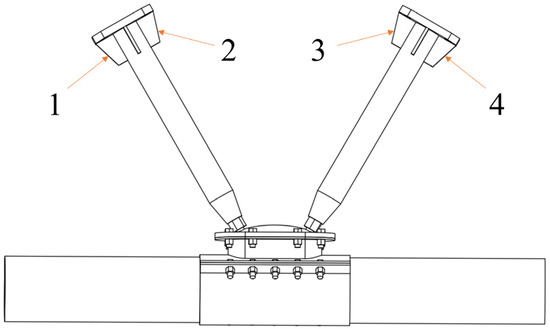 To accurately determine the stress–strain distribution of the weak parts of the sample and the displacement of the sample, displacement transducers and strain gauges were placed at the locations shown in Figure 6 and Figure 7. The axial load displacement curves of the tensioned and compressed web members were obtained by arranging displacement meters 1–4 along the axial direction at the loading end of the web member. The ball table acts to limit the rotation of the bolt ball in all directions, and there are specific welds between it and the object that it encloses. The function of the pressure plate is to prevent the bolt ball from falling off the upper part of the ball table. These two parts are prone to stress concentration. Consequently, triaxial strain gauges were installed at the welding points between the ball table and the wrapped item, and two sets of strain gauges were located at the long and short edges of the press plate. The test was conducted using a DH3820 high-speed static strain gauge to collect data from the above measurement points.