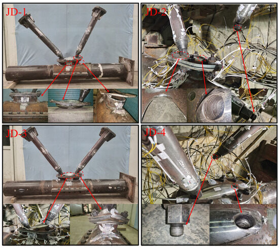 The failure modes of the joints are shown in Figure 8. For JD-1, when the tension web member load increased by 186 kN, the tension table press plate and ball table bearing plate began to show plastic deformation. When the tension web load increased to 213 kN, the thrust side press plate and ball table support plate also began to show plastic deformation. When the load was increased to 235 kN, the ellipsoid began to distort toward the tensile side of the ball table, causing a certain degree of bending deformation in the cylinder body on that side. When the load increased to 278 kN, the sample ball table area at the tensile side issued a “bang” sound, the ball table area tensile side of the ball table cylinder and the ball table support plate weld cracked, and JD-1 was damaged. For JD-2, when the load of the tensile web member was increased to 245 kN, plastic deformation occurred on the tensile side of both the pressure plate and the ball table support plate, When the load was increased to 260 kN, the ellipsoidal ball on the tensile side emitted the sound of metal collision, obvious deformation traces were found at the bolt holes of the tensile side, and the ball table support plate on the thrust side showed plastic deformation. When the load was increased to 290 kN, the high-strength bolts connecting the tensile web and ellipsoid were pulled out and JD-2 was damaged. For JD-3, when the load on the tensile web member was increased to 198 kN, plastic deformation was observed in the tensile side pressure plate and ball table support plate, and at a load of 290 kN, the thrust side ball table support plate also started to exhibit plastic deformation. When the load was increased to 330 kN, the inner edge of the ball table support plate exhibited noticeable cracks on the tensile side of the sample. When the load increased to 342 kN, the table area on the tension side of the press plate buckled and broke, the tension side of the press plate was torn through, and JD-3 was destroyed. For JD-4, when the tensioned web member load increased to 240 kN, plastic deformation began to appear on the tensioned side pressure plate and table support plate. When the load increased to 310 kN, a metallic friction and collision sound was detected from the tension side ball table area and a clear gap appeared at the connection between the web member and the ellipsoid. When the load reached 390 kN, the high-strength bolts of the tension web member were pulled out of the ellipsoid, and JD-4 failed.