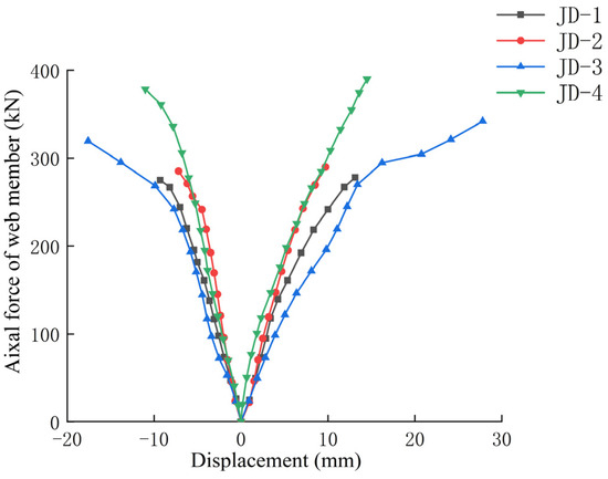 To accurately demonstrate the deformation of the sample under loading, the axial force deformation curves of the tension and thrust web members were plotted for the four joints as shown in Figure 9.