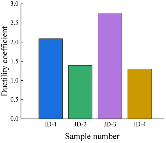 According to the “Code of Test Methods for Seismic Resistance of Buildings” [23], the displacement at which plastic deformation begins at a joint is defined as the yield displacement, and the displacement at which the sample completely fails is defined as the failure displacement. The ductility coefficient of the sample is given by: .