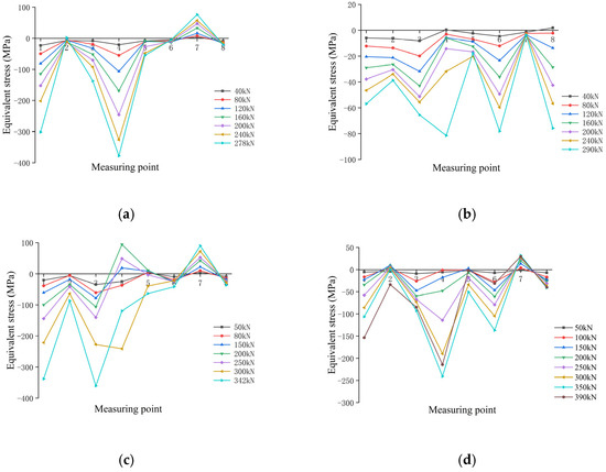 Equivalent stress curve of pressure plate. (a) JD-1, (b) JD-2, (c) JD-3, and (d) JD-4.