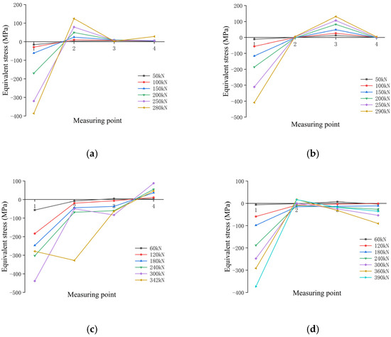 As an important load-bearing part to restrain the upward rotation of the ellipsoid, the internal ellipsoid is extruded, and can easily tear and become damaged. To clearly understand the damage process and stress distribution in the loading process, it is highly important to analyze the stress. Figure 12 shows the stress distribution for each sample. The maximum equivalent stresses of the four joints are found at the measurement point No. 1, and for all four samples, the measurement point No. 1 and the various parts of the pressure plate show high stress variations due to the loading process. In the test, the two limbs of the web member are under tensile stress, thrusting under the action of the ellipsoid to the tensile side of the warping, but the other measurement points are in different conditions. The equivalent stress at point 1 of JD-1 reached 386 MPa at maximum tension, that at point 2 reached 124 MPa, and the stresses at the remaining points were lower. Due to the ellipsoid warpage, the measurement point No. 2 slightly deviated from the axis, which led to deflection and extrusion to the side of the No. 2 measuring point, causing a certain deformation of the curved bevel here, giving rise to tensile stress. The stress at measurement point No. 1 of JD-2 reached 408 MPa, and that at measuring point No. 3 was 131 MPa. When the wall thickness of the JD-2 ball table increased to 10 mm, there was collision and interference between the pressure plate and the thrusted web member sleeve, leading to extrusion and deformation at measuring point No. 3. The tensile force at the JD-3 pressure plate measurement point No. 1 was approximately 300 kN, with a maximum value of 438 MPa. When loaded to the destruction load of 342 kN, the equivalent stress of measurement point No. 1 was reduced to 279 MPa. This point is located in the short axis direction of the pressure plate measurement point No. 2, with a higher stress of 328 MPa; owing to the presence of a large pressure plate, the stress is very poor. The maximum stress was small before loading to 300 kN, but after loading to the destructive load, the pressure plate was completely torn and the deformation was generated dramatically, leading to a sharp jump in the stress at the testing point; this was due to the fact that during the loading process, the ellipsoid warped to the tensile side, and a processing error inevitably occurred in the processing of the pressure plate. The short axis direction and the ellipsoid body do not fully adhere to the ellipsoid body, resulting in the ellipsoid extruding toward the No. 4 position. When the load reached 360 kN, the stress at measurement point No. 4 jumped, and as the load further increased, the JD-4 specimen in the destruction of the tensile web member was extracted, and then the stress at measurement point No. 4 stress dropped significantly.
