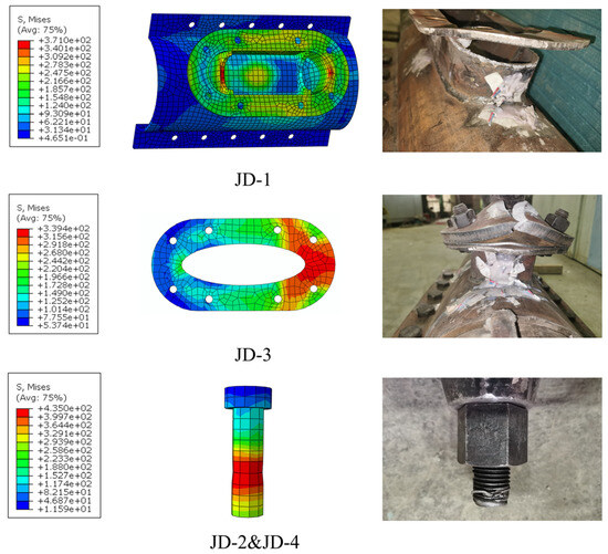 The finite element simulation results are shown in Figure 13. Comparison of the red high-stress area in the cloud diagram with the actual damaged parts of the four samples shows that the model simulation of the damage phenomenon and the actual test damage morphology are in agreement, and the high-stress area of the sample coincides with the damaged parts of the four samples. A comparison of the damaged parts was conducted, namely JD-1 for the ball table cylinder and pressure plate tensile side weld tear, JD-3 for the pressure plate tensile side tear, JD-2 and JD-4 for the tensile web member and ellipsoidal connection of high-strength bolt thread damage. These parts, according to the results of the finite element analysis, are also high-stress areas (red areas). The equivalent stress distribution of each major component is closer to the equivalent stresses measured at the corresponding test points of the sample. By extracting the axial force and displacement of the web member from the finite element analysis results, the load-displacement curves were plotted and compared to the test results, as shown in Figure 14 and Table 4. The error between them is within 11%, indicating that the finite element analysis results and the test results have a high degree of agreement, and the trends of the curves are also highly similar. This shows that ABAQUS can accurately simulate these types of joints and can be used for the subsequent investigation of a greater range of parameters.