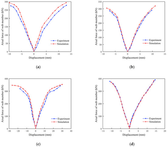 Comparison diagram of load displacement curve of web member. (a) JD-1, (b) JD-2, (c) JD-4, and (d) JD-4.