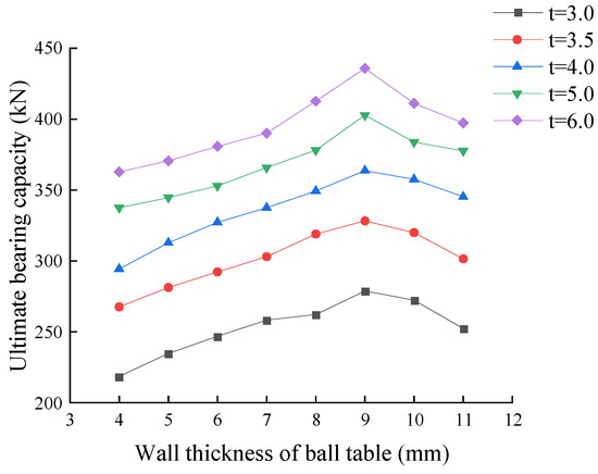 (4) According to the results of the finite element method calculations, if the ball table wall thickness exceeds 9 mm, the enhancement effect on the joint’s ability to bear a load is significantly weakened, and a ball table wall thickness of 10 mm negatively affects the joint bearing capacity. When the web member wall thickness exceeds 5 mm, the joint bearing capacity is less sensitive to the increase in the wall thickness.