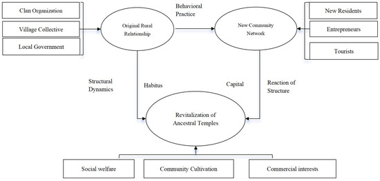 Field theory provides a valuable lens through which to understand social practices. It facilitates the advancement of social practice theory. Hegel eliminated the dichotomy between labor and practice, integrating labor activities and their results as part of creativity [49]. The conflict between structural determinism and consciousness determinism diminished throughout time, giving rise to a more neutral interpretative approach. This multi-agent, multi-factor observational perspective corresponds with the attributes of contemporary rural spatial revitalization. Additionally, field theory, emerging from the spatial turn in sociological theory, serves as a tool for exploring the interaction between material and social spaces [50,51]. This approach enhances understanding of interactions among various populations in communities and the revitalization of ancestral temples during rural micro-renewal. Furthermore, it also sheds light on the evolution of social relationship networks throughout this process.