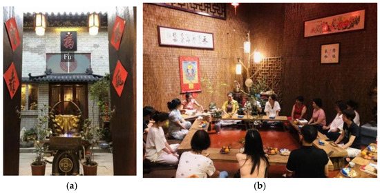 The engagement of social capital highlights the profound cultural and humanistic legacy inherent in Whampoa. Such efforts enable the revitalization and transformation of these spaces into economically sustainable places or architectural structures. The Ancestral Temple of Zixi Hu has been converted into an artist’s studio, providing paid meditation workshops (Figure 5a,b). According to its administrator, Mr. Zhang, this space welcomes individuals from diverse religious beliefs, socioeconomic statuses, and educational backgrounds, promoting an environment that facilitates self-discovery and personal development.