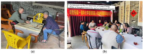 (a) Residents are playing chess at the Feng’s Ancestral Temple; (b) Liangcheng TV drama collection forum (Source: picture 6(a,b) were taken by the authors).