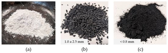 (2) Recycled rubber aggregates (Figure 1b,c): These aggregates are obtained from end-of-life tyres, and in this study, were recovered and revalorised by the company SIGNUS Ecovalor, S.L. (Madrid, Spain). These aggregates were supplied in two different granulometries, one with a particle size between 1.0 and 2.5 mm, called ‘granulate’, and the other with a particle size of less than 0.8 mm, called ‘powder’. These sizes, granular and powder, are the ones commonly marketed for building applications [], with the aggregate size varying according to the final application of these by-products. The main physical and chemical characteristics are listed in Table 2 [,,,,,,,,,,,,,,,,,,,,,,].