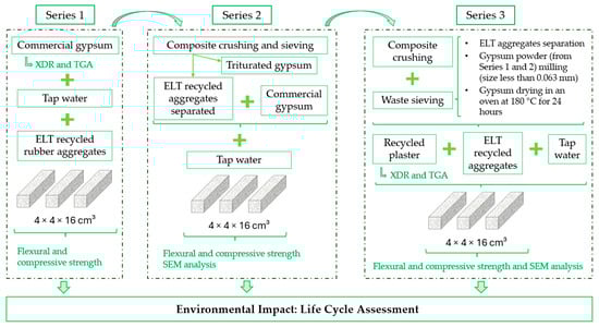 As shown in Figure 2, to analyse the recyclability of gypsum composites with ELT aggregates, each series included a further stage in the recycling process of these products. Thus, in Series 1, gypsum composites were produced by partially substituting the original raw material with recycled rubber aggregates. Subsequently, and once their mechanical properties had been analysed, the samples were crushed and sieved, separating the recycled rubber from the gypsum material. The separated rubber from each sample was used for the counterpart specimen of Series 2, and a commercial plaster was used as a binder. It is important to mention that the rubber used in Series 2 contains gypsum dihydrate as an impurity created during the crushing process. With these recovered compounds, new samples were processed, and their mechanical properties were analysed. Finally, in Series 3, composites were produced using the recycled gypsum powder material as a binder. This recycled gypsum was obtained from the crushing and screening of the composites produced in the previous series 1 and 2, with a final step of drying (180 °C, 24 h) to obtain hemihydrate. These Series 3 materials made with recycled gypsum and ELT rubber aggregates (powder and granules) were mechanically tested with regard to bending and compression to determine their mechanical properties. During the process, physicochemical characterisation tests (X-ray diffraction and thermogravimetric analysis) were conducted to determine the effectiveness of the recycling process, as well as microscopy studies on samples from Series 2 and 3. Finally, a study of the environmental impact of each gypsum composite presented was carried out using a life cycle analysis.