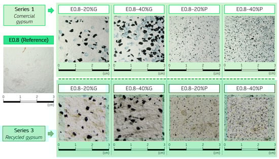 In all the composites produced in Table 3, a water/gypsum ratio of 0.8 by mass was chosen. While this ratio for the compounds in Series 1 provided a fluid consistency in accordance with UNE-EN 1379-2:2014 [], it allowed a plastic consistency to be obtained in the compounds produced in Series 2 and 3. This is due to two reasons: (i) the rubber aggregates used in Series 2 and recovered from Series 1 composites, after crushing and sieving, presented CaSO4·2H2O impurities that acted as accelerators in the setting process []; and (ii) the Series 3 composites were made with recycled plaster powder, which may also have contained dihydrate impurities that could have decreased the workability time of the mixture in the liquid state [].