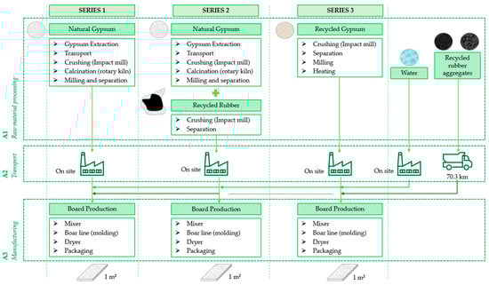 The declared unit taken as a reference for the development of the LCA was 1 m2 of 12.5 mm thick commercial plasterboard, to be used in the finishing layer of lightweight partition walls. This stated unit serves as a reference for comparing the impacts of the different composites of each series analysed in this research. The boundary conditions for this analysis include the environmental impact derived from the extraction of raw materials to the manufacturing and packaging of these prefabricated panels (cradle-to-gate), as shown in the diagram in Figure 4.