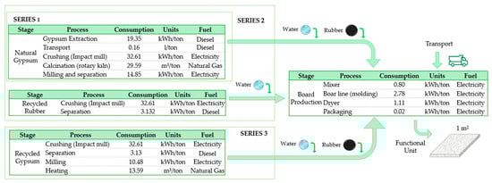 One of the main objectives of this work was to evaluate the environmental performance of the different gypsum composites, thus analysing the environmental impacts derived from the manufacture of these composites in each of the three series elaborated. For this purpose, the life cycle analysis (LCA) methodology, which is widely used in research works, was followed [] and split into the following steps: objective and scope definition; inventory analysis; and impact assessment []. Each of these sections is described below according to the methodology used.