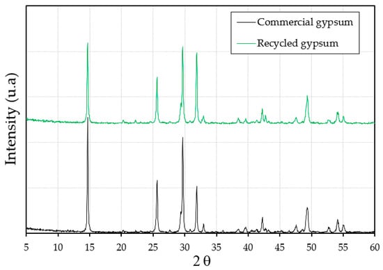 The purpose of this section is to show the effectiveness of the gypsum material recycling process. In this way, Figure 6 gathers the diffractograms corresponding to the two raw materials used as binders in this research: commercial gypsum and recycled gypsum.