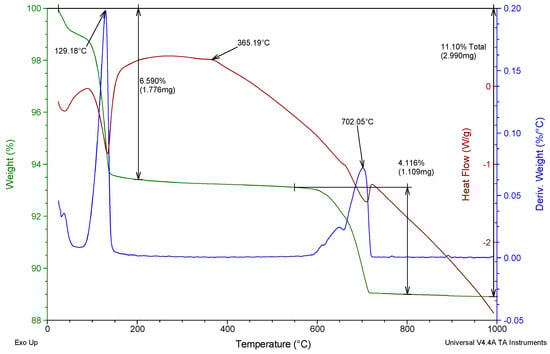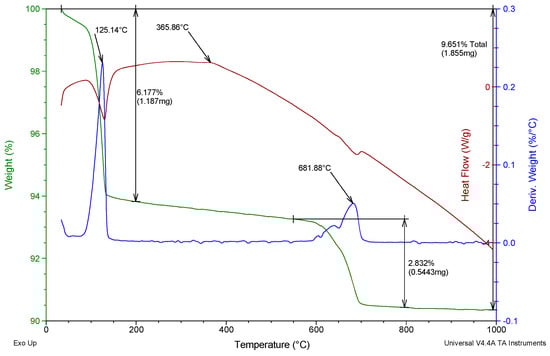 As can be observed, the mass loss and main thermal events of the commercial gypsum and recycled gypsum are presented in Table 6. These data are derived from the thermograms shown in Figure 7 and Figure 8. In both compounds, there is an initial loss of mass corresponding to the dehydration of the gypsum hemihydrate (CaSO4·1/2H2O) to soluble anhydrite III (CaSO4) []. This initial mass variation occurs at a temperature below 200 °C, with a maximum mass loss rate of around 125–130 °C, and similar mass losses of around 10%. Next, in both samples, the exothermic transition from anhydrite III to insoluble anhydrite II can be seen at around 360 °C, with no associated mass loss, indicating that both gypsum samples contain hemihydrate-β. Finally, for both raw materials, a loss of mass between 550 and 800 °C—less than 5% in both compounds—is observed, corresponding to the decomposition of calcium carbonate (CaCO3) present in the gypsum to give rise to calcium oxide (CaO) [,].