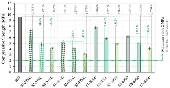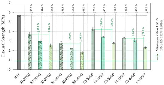 Firstly, the results of the flexural strength (Figure 9) and compressive strength (Figure 10) tests, obtained on standardised RILEM prismatic specimens of 4 × 4 × 16 cm3 for each dosage and series produced, are presented. To facilitate the interpretation of the results, the minimum strength value recommended by the UNE-EN 13279-2:2014 standard [] has been included in the graphs for each test, as well as the percentage decrease in all the samples with respect to the reference (black) and the variation between samples with the same composition and different series (green).