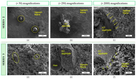 First, in the top row of Figure 11, the results obtained for sample S2-40%P are shown. Series 2 composites are peculiar in that the rubber is recovered after a process of crushing and sieving of the original sample, ensuring that gypsum dihydrate impurities are contained on its surface. As a consequence, these compounds experience faster setting, as the dihydrate acts as a crystallisation nucleus and reduces workability []. This can be seen in Figure 11a, which shows where pores have formed during the setting process. Although the dispersion of the rubber in the matrix appears homogeneous, the bonding between the new gypsum material used as a binder and the surface dihydrate adhered to the rubber can weaken the composite and reduce its mechanical strength []. In Figure 11b,c, it is shown that the integration of the rubber residue in the matrix is good and there are no voids between the added particle and the composite. This has a positive effect on the integration of these ELT wastes in the construction sector, which is one of the most viable alternatives currently available [].