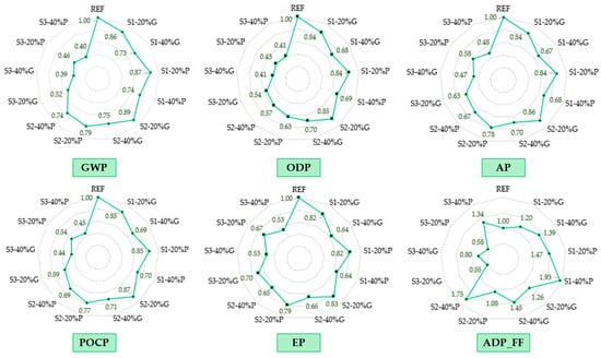 In Figure 12, the impact of each composite compared to the reference for each indicator analysed can be observed. Each diagram represents the variation in each impact category compared to the reference solution.