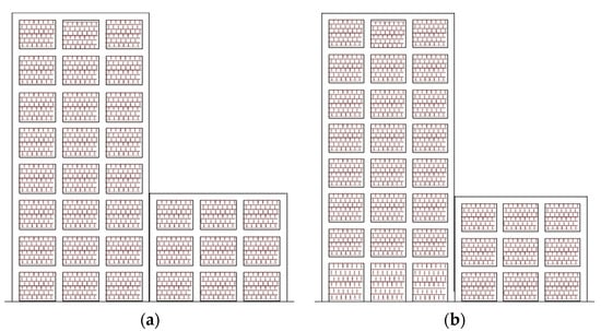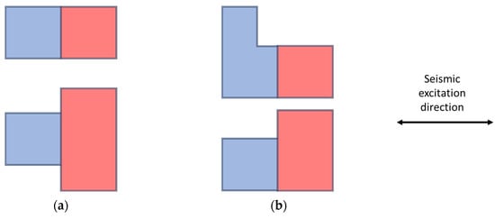 Many researchers have reported as early as the nineteen-eighties and -nineties that one of the usual causes of earthquake losses is the so-called seismic interaction, i.e., the collisions that take place between adjacent buildings which are in contact or separated by an inadequate seismic joint [,,,,,]. The phenomenon, which is also referred to in the literature as seismic pounding, arises due to out-of-phase vibration of the interacting structures and is more pronounced when their dynamic characteristics are essentially different. For example, seismic interaction is particularly intense in cases where the adjacent structures have different heights, belong to different structural types (frame, wall, dual systems), or are made of different materials (reinforced concrete, masonry, steel, etc.). With regard to the relative location of the adjoining buildings, the seismic interaction is categorized as being symmetric or asymmetric (Figure 1). The fundamental difference between these two kinds of interaction is that the asymmetric one induces additional torsional oscillations of the floors. Moreover, with regard to the relative storey levels of the buildings, the seismic pounding is characterized either as floor-to-floor (type A) or as floor-to-column (type B). In the former, the collisions take place between the slabs, while in the latter, the slabs of one building strike the external columns of the other within their clear height (Figure 2).