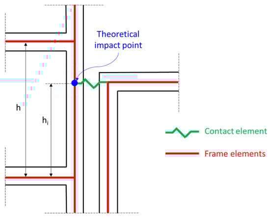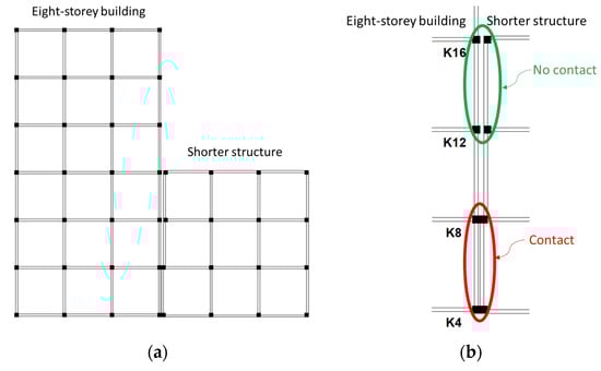 The layout of the interacting buildings (Figure 7a) is such that they are in partial contact or they come into partial contact during an earthquake. Thus, the seismic interaction between them is asymmetric; i.e., torsional vibrations of the floors around the vertical axis are induced. It is considered that the contact is limited at two points per floor only (columns Κ4 and Κ8), as illustrated in Figure 7b. For example, for seismic interaction between buildings “infilled” and “6”, there are 12 impact points. These points lie at the floor levels of the shorter structure. This choice is adopted by almost all similar studies because it is consistent with field observations which indicate that collisions take place mainly at these levels. In addition, the damage of the external columns is concentrated in a small area around them (effective impact length). Considering additional impact points (e.g., at the floor levels of the higher structure) would not alter the local behavior of the external columns of the eight-storey buildings, whereas the overall response depends only on the characteristics of the contact point at the shorter structure’s top floor []. As has been demonstrated in the past [,,], in cases where the collisions take place at few points per floor lying far from the rigidity axis of the buildings, the torsional and overall responses are maximized.