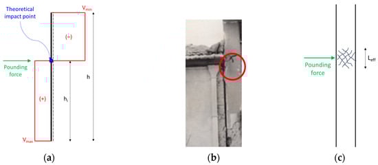 The simplified structural models usually utilized for the analysis of interacting structures indicate that the whole height of a column that undergoes significant pounding forces is affected. In particular, the shorter of the two parts in which the column is divided by the theoretical impact point experiences excessive shear forces (Figure 4a). However, as resulted from experimental studies [,] as well as from field observations (Figure 4b), severe shear damage is concentrated to a small part of the column with lengths of about 1 m or less. This length is characterized as the effective impact length Leff (Figure 4c). Typically, Leff lies at the floor level of the adjacent structure. It is apparent that a reliable estimation of the effective impact length is of great importance because it permits engineers to focus on this area during the initial design process of new buildings or the suggestion of retrofitting measures of existing buildings.
